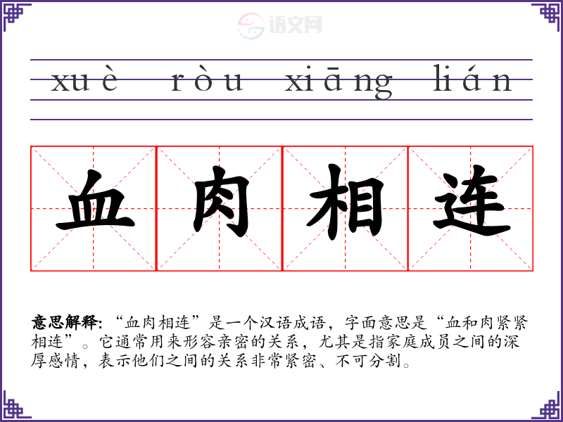 “血肉相连”是一个汉语成语,字面意思是“血和肉紧紧相连”。它通常用来形容亲密的关系,尤其是指家庭成员之间的深厚感情,表示他们之间的关系非常紧密、不可分割。