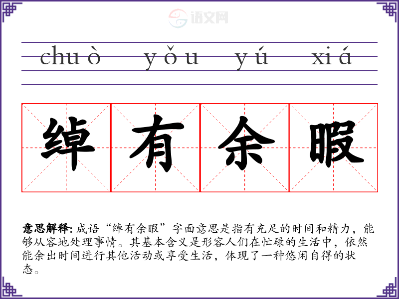 成语“绰有余暇”字面意思是指有充足的时间和精力,能够从容地处理事情。其基本含义是形容人们在忙碌的生活中,依然能余出时间进行其他活动或享受生活,体现了一种悠闲自得的状态。