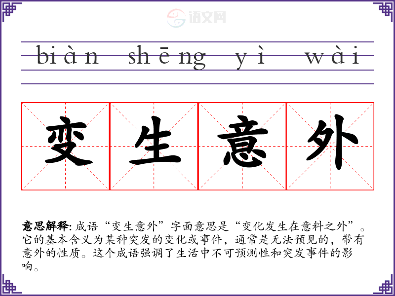 成语“变生意外”字面意思是“变化发生在意料之外”。它的基本含义为某种突发的变化或,通常是无法预见的,带有意外的性质。这个成语强调了生活中不可预测性和突发的影响。