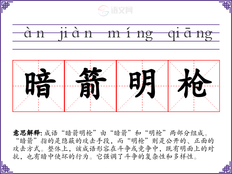 通过对“暗箭明枪”的学,我更加理解了在交流和竞争中保持警惕的重要性。这一成语在语言学上不仅丰富了我的表达,还让我意识到在生活中如何更好地应对复杂的人际关系。