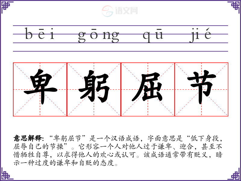 “卑躬屈节”是一个汉语成语,字面意思是“低下身段,屈辱自己的节操”。它形容一个人对他人过于谦卑、迎合,甚至不惜牺牲自尊,以求得他人的欢心或认可。该成语通常带有贬义,暗示一种过度的谦卑和自贬的态度。