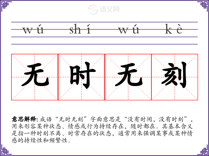 “无时无刻”在**文化中常常用来形容对某人或某事的深厚情感,比如对亲人、恋人、理想等的持久关注。在现代社会中,这个成语也可以用来描述对工作的执着和对某项事业的热爱,反映出当代人对生活和工作的追求。