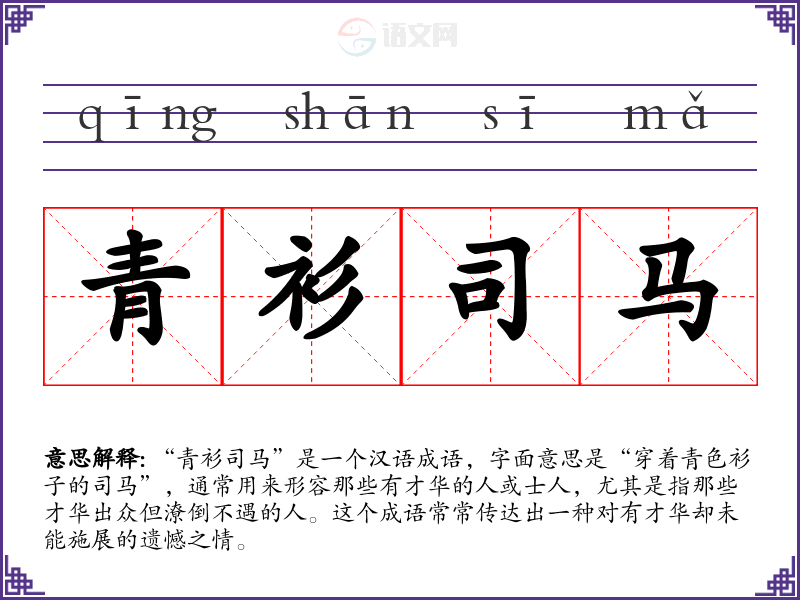 “青衫司马”是一个汉语成语,字面意思是“穿着青色衫子的司马”,通常用来形容那些有才华的人或士人,尤其是指那些才华出众但潦倒不遇的人。这个成语常常传达出一种对有才华却未能施展的遗憾之情。