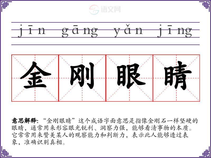 通过对“金刚眼睛”的学,我更加理解了观察力和洞察力在生活中的重要性。这个成语不仅丰富了我的语言表达,也促使我在学和生活中更加关注事物的本质。我会努力培养自己的“金刚眼睛”,以更好地理解和应对复杂的现实世界。