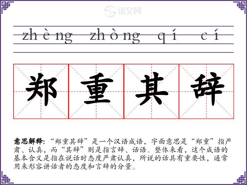 “郑重其辞”是一个汉语成语,字面意思是“郑重”指严肃、认真,而“其辞”则是指言辞、话语。整体来看,这个成语的基本含义是指在说话时态度严肃认真,所说的话具有重要性,通常用来形容讲话者的态度和言辞的分量。