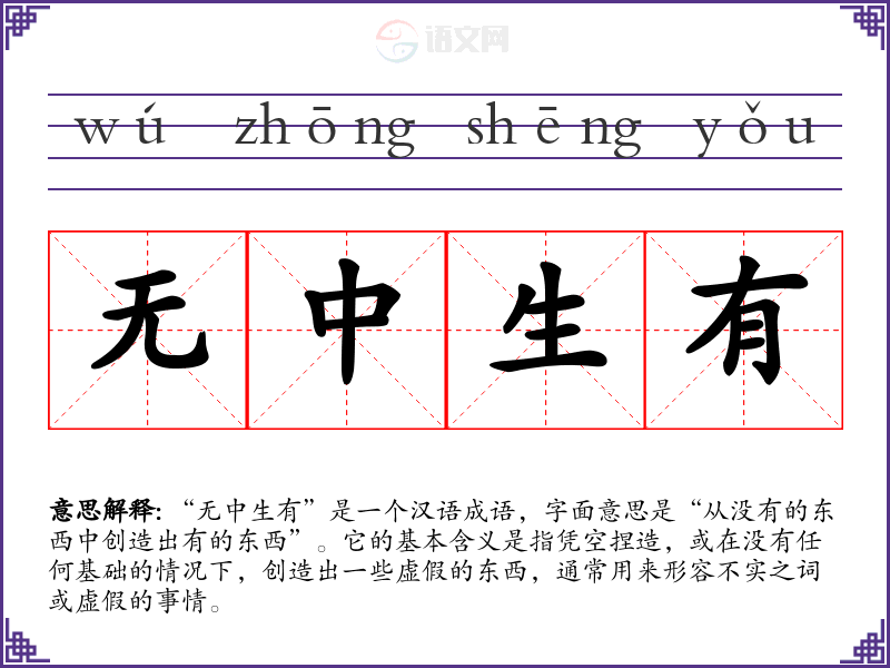 “无中生有”是一个汉语成语,字面意思是“从没有的东西中创造出有的东西”。它的基本含义是指凭空捏造,或在没有任何基础的情况下,创造出一些虚假的东西,通常用来形容不实之词或虚假的事情。