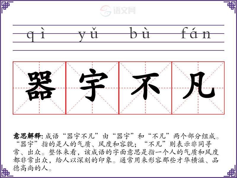 成语“器宇不凡”由“器宇”和“不凡”两个部分组成。“器宇”指的是人的气质、风度和容貌;“不凡”则表示非同寻常、出众。整体来看,该成语的字面意思是指一个人的气质和风度都非常出众,给人以深刻的印象。通常用来形容那些才华横溢、品德高尚的人。