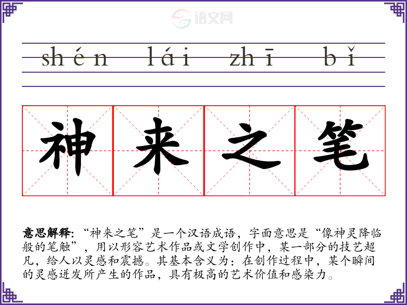 “神来之笔”是一个汉语成语,字面意思是“像神灵降临般的笔触”,用以形容艺术作品或文学创作中,某一部分的技艺超凡,给人以灵感和震撼。其基本含义为:在创作过程中,某个瞬间的灵感迸发所产生的作品,具有极高的艺术价值和感染力。