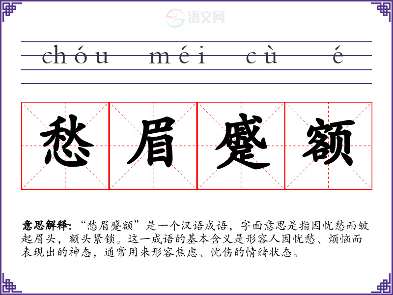 “愁眉蹙额”是一个汉语成语,字面意思是指因忧愁而皱起眉头,额头紧锁。这一成语的基本含义是形容人因忧愁、烦恼而表现出的神态,通常用来形容焦虑、忧伤的情绪状态。