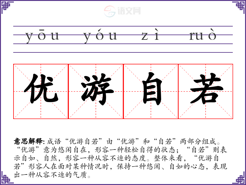 成语“优游自若”由“优游”和“自若”两部分组成。“优游”意为悠闲自在,形容一种轻松自得的状态;“自若”则表示自如、自然,形容一种从容不迫的态度。整体来看,“优游自若”形容人在面对某种情况时,保持一种悠闲、自如的心态,表现出一种从容不迫的气质。