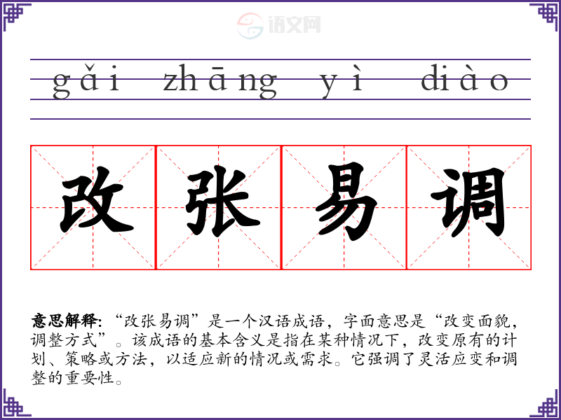 “改张易调”是一个汉语成语,字面意思是“改变面貌,调整方式”。该成语的基本含义是指在某种情况下,改变原有的计划、策略或方法,以适应新的情况或需求。它强调了灵活应变和调整的重要性。