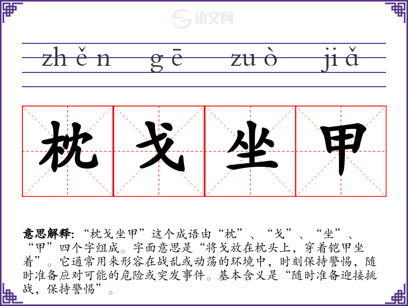 “枕戈坐甲”这个成语由“枕”、“戈”、“坐”、“甲”四个字组成。字面意思是“将戈放在枕头上,穿着铠甲坐着”。它通常用来形容在战乱或动荡的环境中,时刻保持警惕,随时准备应对可能的危险或突发**。基本含义是“随时准备迎接挑战,保持警惕”。