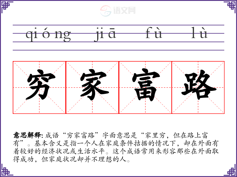 在**社会,家庭背景和个人努力往往被视为成功的重要因素。成语“穷家富路”体现了人们对家庭经济条件与个人奋斗之间关系的关注。在现代社会,这个成语依然具有现实意义,许多人在外努力拼搏,试图改变家庭条件。