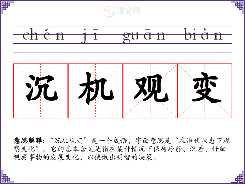 通过对“沉机观变”的学,我认识到在生活和学中,保持冷静、仔细观察是多么重要。这个成语不仅丰富了我的语言表达能力,也让我在面对挑战时能够更加从容自信。