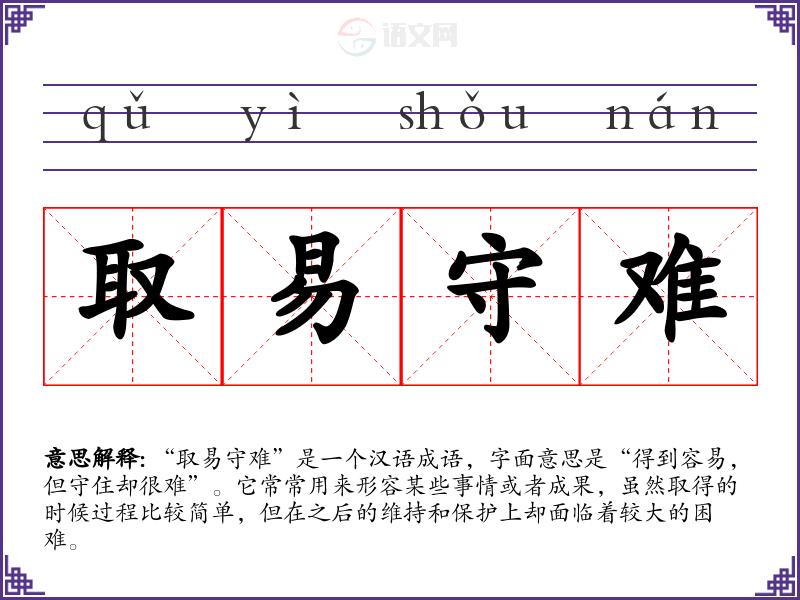 “取易守难”是一个汉语成语,字面意思是“得到容易,但守住却很难”。它常常用来形容某些事情或者成果,虽然取得的时候过程比较简单,但在之后的维持和保护上却面临着较大的困难。