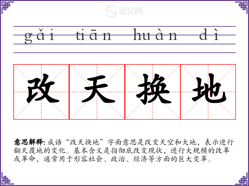 “改天换地”最早出现在近现代,具体的文学出处较难考证,但其本意可以追溯到古代哲学和文学中对变革的探讨。成语中“改天”与“换地”均暗示了一种从根本上改变事物的意图,反映了**文化中对变革的重视。
