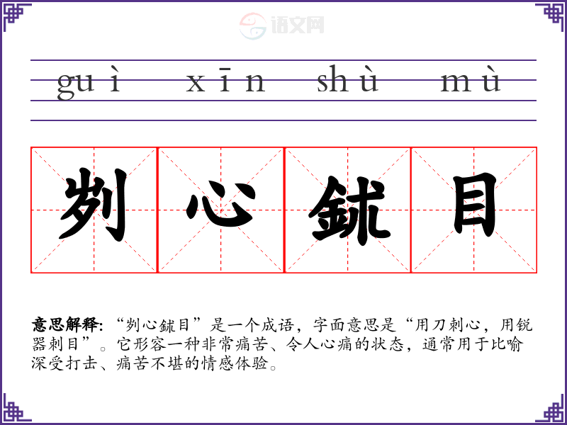 “刿心鉥目”是一个成语,字面意思是“用刀刺心,用锐器刺目”。它形容一种非常痛苦、令人心痛的状态,通常用于比喻深受打击、痛苦不堪的情感体验。