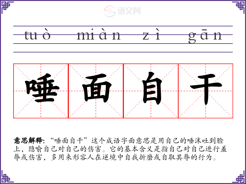 “唾面自干”这个成语字面意思是用自己的唾沫吐到脸上,隐喻自己对自己的伤害。它的基本含义是指自己对自己进行羞辱或伤害,多用来形容人在逆境中自我折磨或自取其辱的行为。