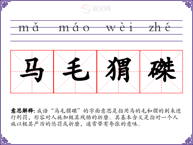 成语“马毛猬磔”的字面意思是指用马的毛和猬的刺来进行刑罚,形容对人施加极其残酷的折磨。其基本含义是指对一个人施以极其严厉的惩罚或折磨,通常带有夸张的意味。