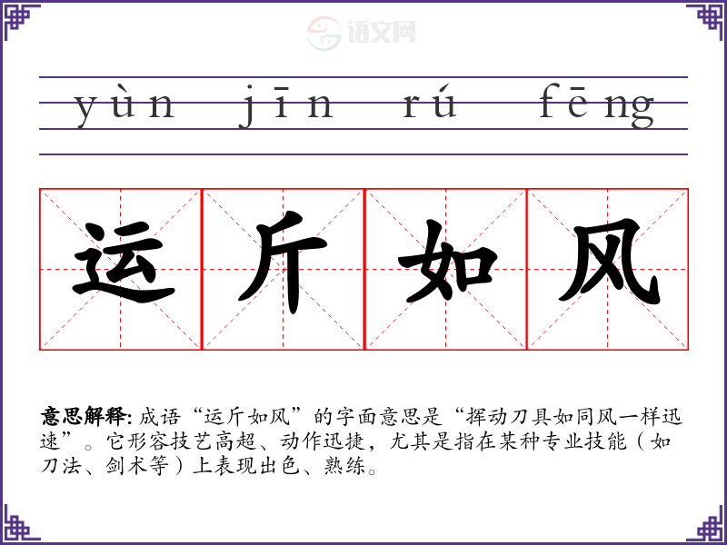 成语“运斤如风”的字面意思是“挥动刀具如同风一样迅速”。它形容技艺高超、动作迅捷,尤其是指在某种专业技能(如刀法、剑术等)上表现出色、熟练。