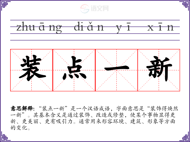 “装点一新”并没有明确的历史典故,但它的构成词汇在中文中常用于形容变化与提升。它可以被视为现代汉语中一种普遍的修饰用法,体现了人们对美好生活和环境的追求。