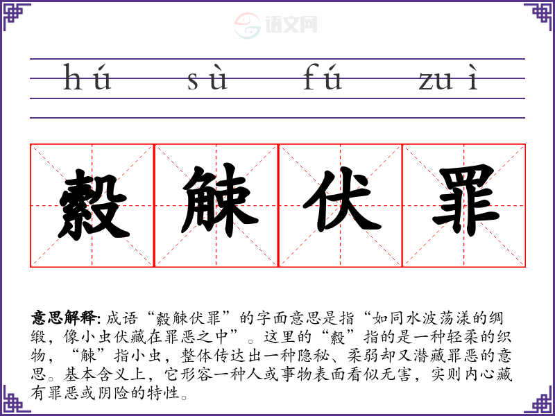 成语“縠觫伏罪”的字面意思是指“如同水波荡漾的绸缎,像小虫伏藏在罪恶之中”。这里的“縠”指的是一种轻柔的织物,“觫”指小虫,整体传达出一种隐秘、柔弱却又潜藏罪恶的意思。基本含义上,它形容一种人或事物表面看似无害,实则内心藏有罪恶或阴险的特性。