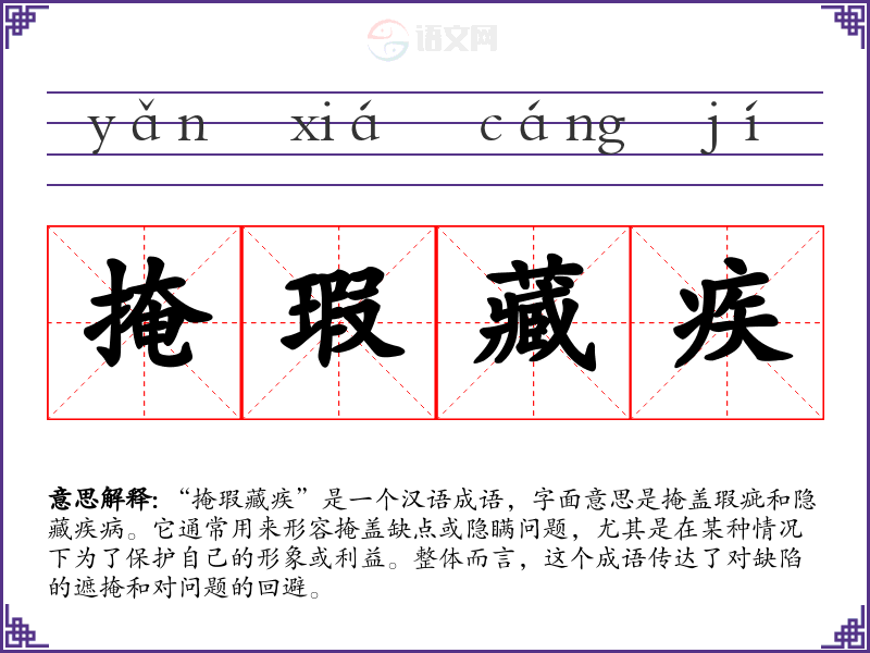 “掩瑕藏疾”是一个汉语成语,字面意思是掩盖瑕疵和隐藏疾病。它通常用来形容掩盖缺点或隐瞒问题,尤其是在某种情况下为了保护自己的形象或利益。整体而言,这个成语传达了对缺陷的遮掩和对问题的回避。