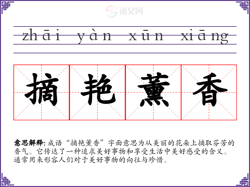 通过对“摘艳薰香”的学,我认识到在生活中细致观察与欣赏美好事物的重要性。这不仅丰富了我的语言表达能力,也让我在繁忙的生活中保持一份宁静与欣喜。该成语在我的语言学与表达中,提供了一种积极的视角,激励我去探索生活中的美。