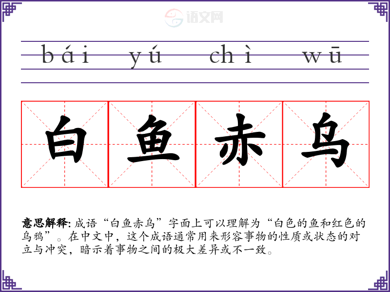 成语“白鱼赤乌”字面上可以理解为“白色的鱼和红色的乌鸦”。在中文中,这个成语通常用来形容事物的性质或状态的对立与冲突,暗示着事物之间的极大差异或不一致。
