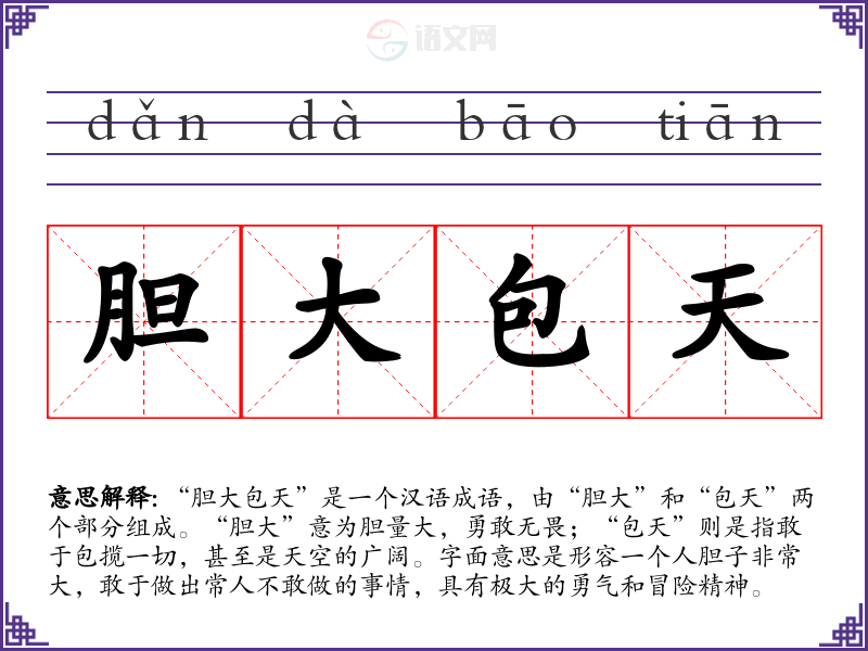 “胆大包天”让我联想到那些勇敢追梦的人,无畏于失败,敢于挑战自我。它在我心中是一种积极向上的力量,激励我在面对挑战时要勇敢面对,而不是退缩。