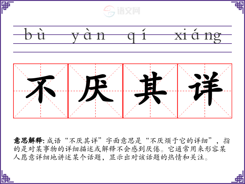成语“不厌其详”字面意思是“不厌烦于它的详细”,指的是对某事物的详细描述或解释不会感到厌倦。它通常用来形容某人愿意详细地讲述某个话题,显示出对该话题的热情和关注。