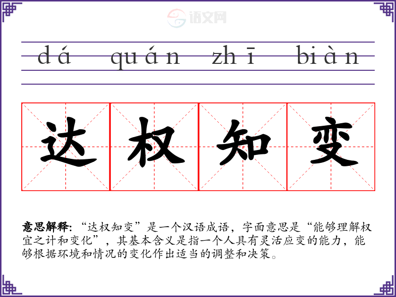 “达权知变”是一个汉语成语,字面意思是“能够理解权宜之计和变化”,其基本含义是指一个人具有灵活应变的能力,能够根据环境和情况的变化作出适当的调整和决策。