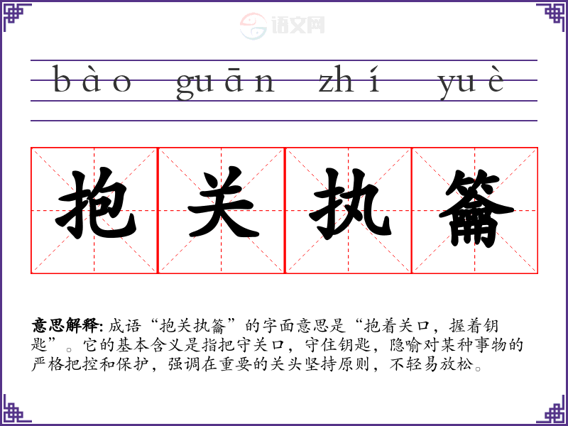 成语“抱关执籥”的字面意思是“抱着关口,握着钥匙”。它的基本含义是指把守关口,守住钥匙,隐喻对某种事物的严格把控和保护,强调在重要的关头坚持原则,不轻易放松。