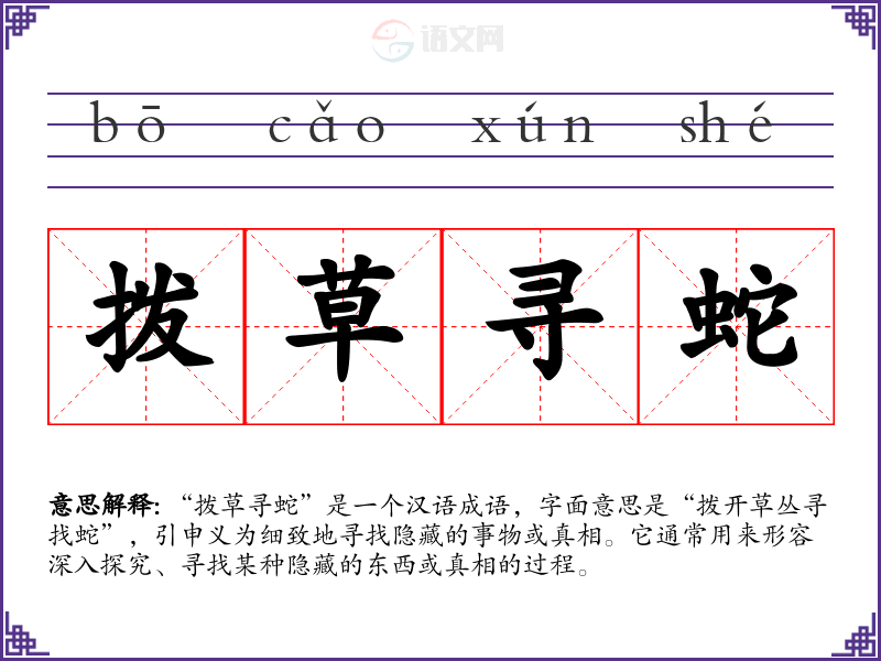 “拨草寻蛇”出自古代文献,常见于对待事物的细致考察,强调了在复杂环境中寻找真相的决心和耐心。成语的历史背景与古代对自然的观察和对动物行为的理解有关,蛇作为一种隐蔽的动物,常常需要通过细致的观察才能找到。