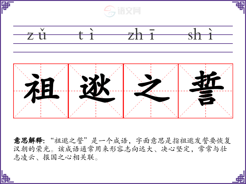 “祖逖之誓”是一个成语,字面意思是指祖逖发誓要恢复汉朝的荣光。该成语通常用来形容志向远大、决心坚定,常常与壮志凌云、报国之心相关联。