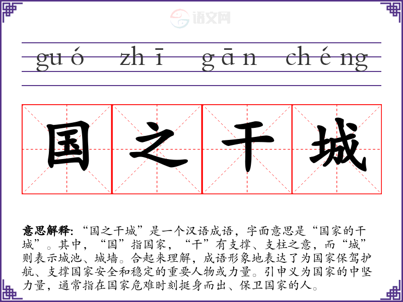 - 在国家危难之际,许多英雄挺身而出,成为了国之干城。