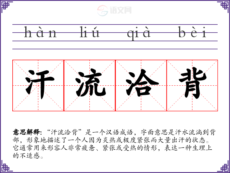 - “汗流浃背”:与“汗流洽背”相似,强调出汗的程度。
