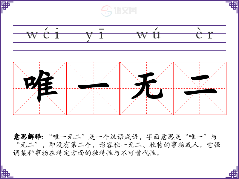 在**文化中,独特性往往被视为一种美德,特别是在艺术、文化、个性等领域。因此,“唯一无二”不仅可以用来描述事物,还可以用来赞美个体的独特性。在现代社会,这个成语也适用于强调创新和个人特色的重要性。