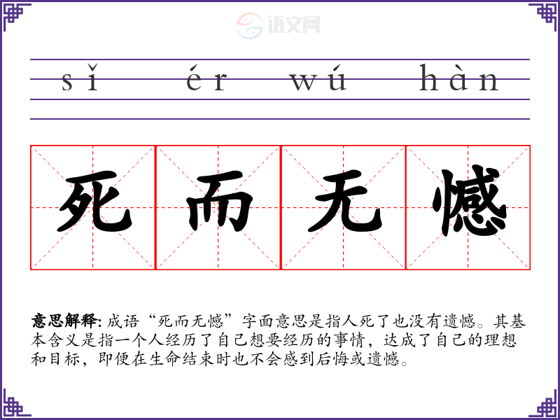 成语“死而无憾”字面意思是指人死了也没有遗憾。其基本含义是指一个人经历了自己想要经历的事情,达成了自己的理想和目标,即便在生命结束时也不会感到后悔或遗憾。
