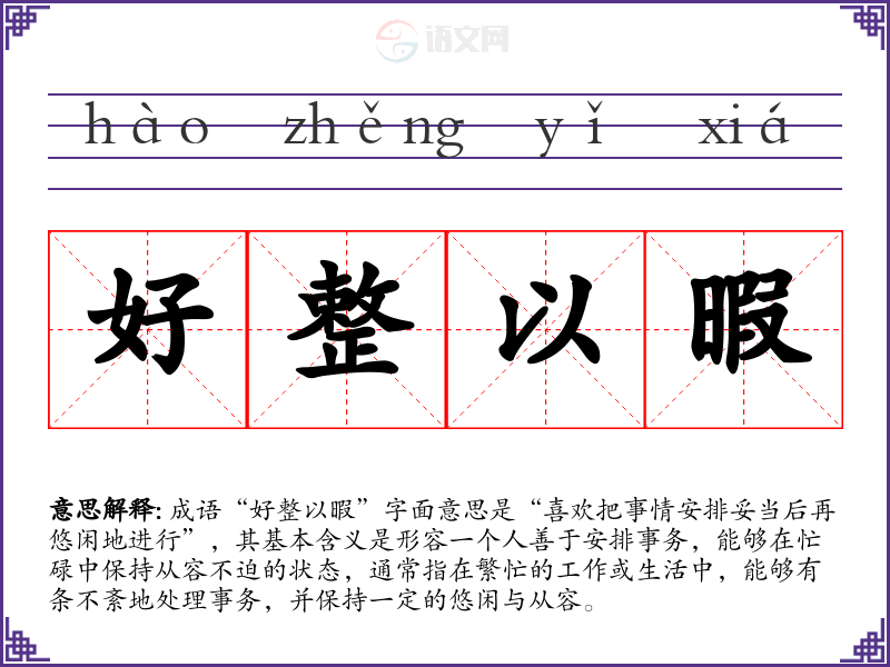 成语“好整以暇”字面意思是“喜欢把事情安排妥当后再悠闲地进行”,其基本含义是形容一个人善于安排事务,能够在忙碌中保持从容不迫的状态,通常指在繁忙的工作或生活中,能够有条不紊地处理事务,并保持一定的悠闲与从容。