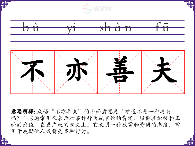 成语“不亦善夫”的字面意思是“难道不是一种善行吗?”它通常用来表示对某种行为或言论的肯定,强调其积极和正面的价值。在更广泛的意义上,它表明一种欣赏和赞同的态度,常用于鼓励他人或赞美某种行为。
