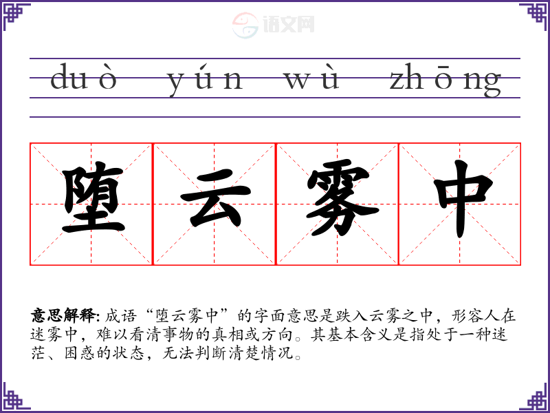 成语“堕云雾中”的字面意思是跌入云雾之中,形容人在迷雾中,难以看清事物的真相或方向。其基本含义是指处于一种迷茫、困惑的状态,无法判断清楚情况。