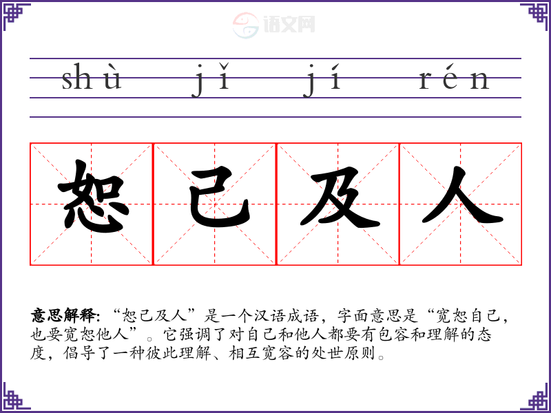 通过对“恕己及人”的深入理解,我认识到宽容和理解在生活中的必要性。它不仅帮助我处理人际关系,还提升了我的情商。在语言学*和表达中,运用这一成语不仅能丰富我的表达,还能传达出更深层次的情感和道德观念。