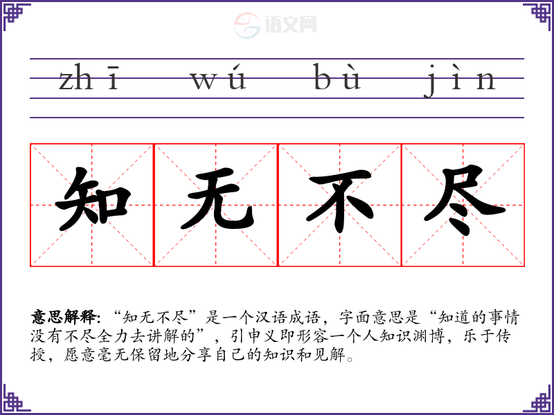 “知无不尽”是一个汉语成语,字面意思是“知道的事情没有不尽全力去讲解的”,引申义即形容一个人知识渊博,乐于传授,愿意毫无保留地分享自己的知识和见解。