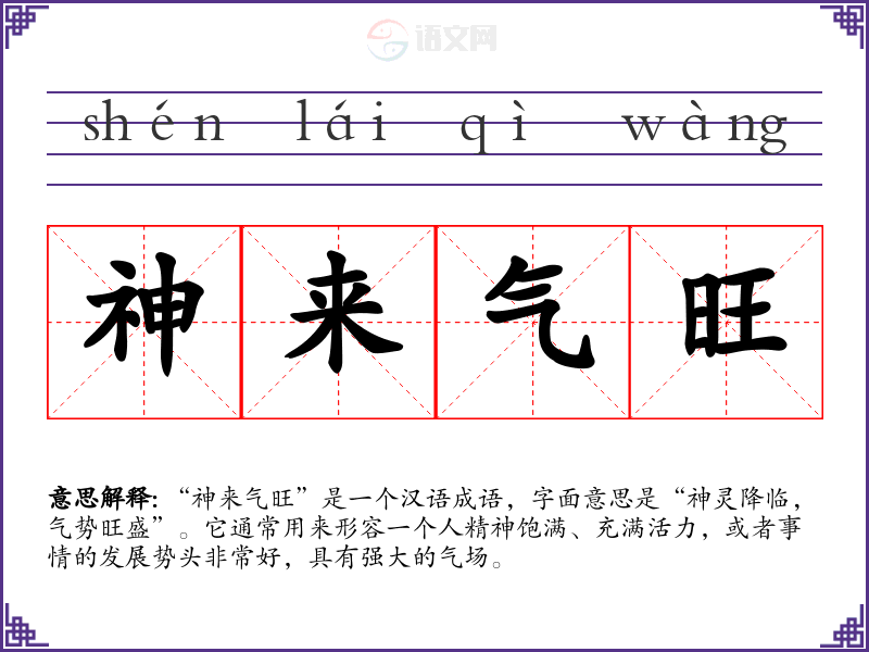 “神来气旺”是一个汉语成语,字面意思是“神灵降临,气势旺盛”。它通常用来形容一个人精神饱满、充满活力,或者事情的发展势头非常好,具有强大的气场。