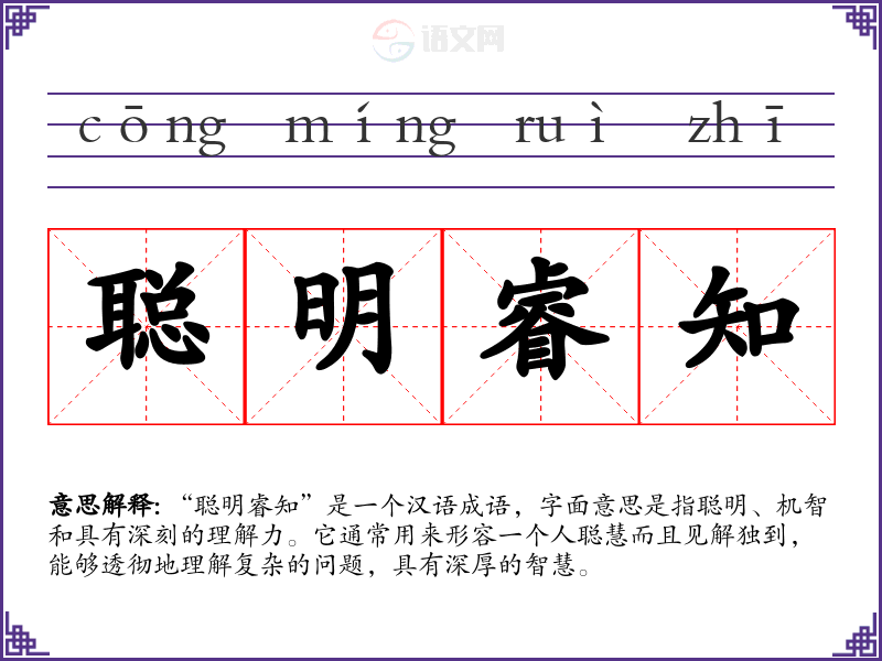 该成语并没有明确的历史典故或文学出处,通常被视作对“聪明”和“睿知”这两个词的组合。它反映了传统文化中对智慧的高度重视,尤其是在哲学和文学作品中,聪明和睿智的人物常被作为理想的个体呈现。