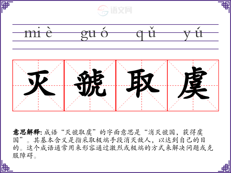 成语“灭虢取虞”的字面意思是“消灭虢国,获得虞国”。其基本含义是指采取极端手段消灭敌人,以达到自己的目的。这个成语通常用来形容通过激烈或极端的方式来解决问题或克服障碍。