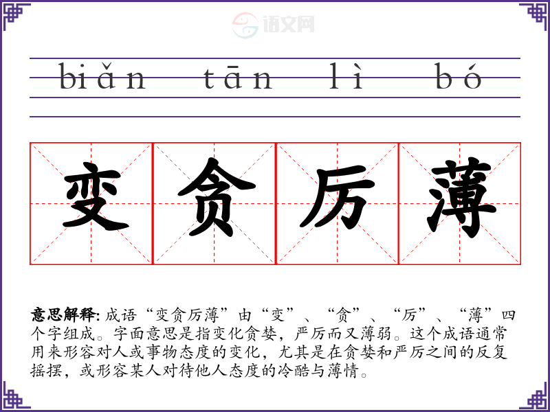 成语“变贪厉”由“变”、“贪”、“厉”、“”四个字组成。字面意思是指变化贪婪,严厉而又弱。这个成语通常用来形容对人或事物态度的变化,尤其是在贪婪和严厉之间的反复摇摆,或形容某人对待他人态度的冷酷与情。