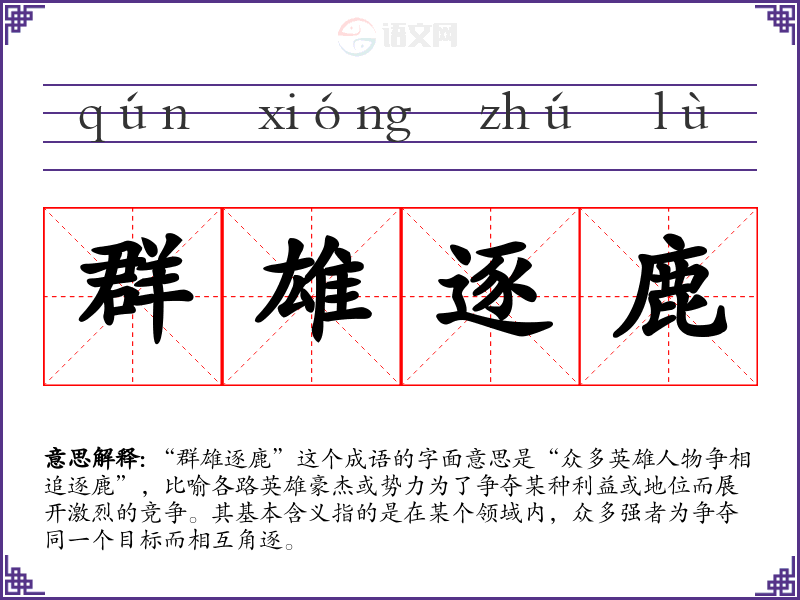 “群雄逐鹿”这个成语的字面意思是“众多英雄人物争相追逐鹿”,比喻各路英雄豪杰或势力为了争夺某种利益或地位而展开激烈的竞争。其基本含义指的是在某个领域内,众多强者为争夺同一个目标而相互角逐。