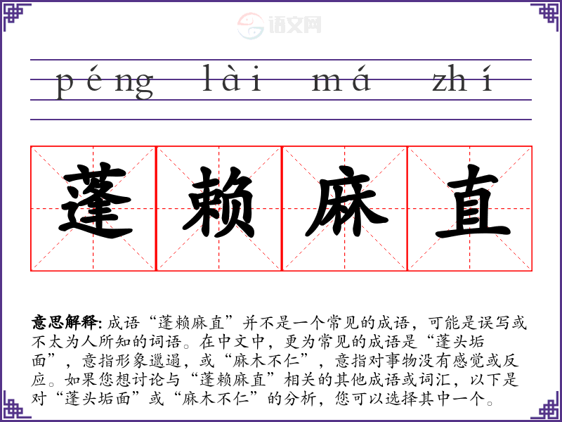 成语“蓬赖麻直”并不是一个常见的成语,可能是误写或不太为人所知的词语。在中文中,更为常见的成语是“蓬头垢面”,意指形象邋遢,或“麻木不仁”,意指对事物没有感觉或反应。如果您想讨论与“蓬赖麻直”相关的其他成语或词汇,以下是对“蓬头垢面”或“麻木不仁”的分析,您可以选择其中一个。